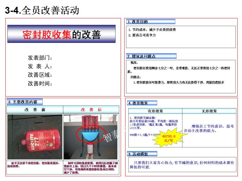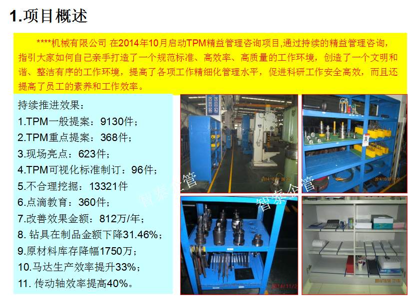 深圳智泰下屬TPM咨詢公司推進的TPM管理不僅僅是設備管理,而是企業(yè)的全面改善,智泰專業(yè)團隊以現(xiàn)場三現(xiàn)為主展開企業(yè)的持續(xù)改進,全面推進TPM全員改善活動,幫助企業(yè)提升6S管理水平,培養(yǎng)優(yōu)秀人才,促進企業(yè)可持續(xù)發(fā)展,最終達成行業(yè)標桿,附件為智泰咨詢顧問團隊在某企業(yè)TPM管理推進的成功案例,請查閱: