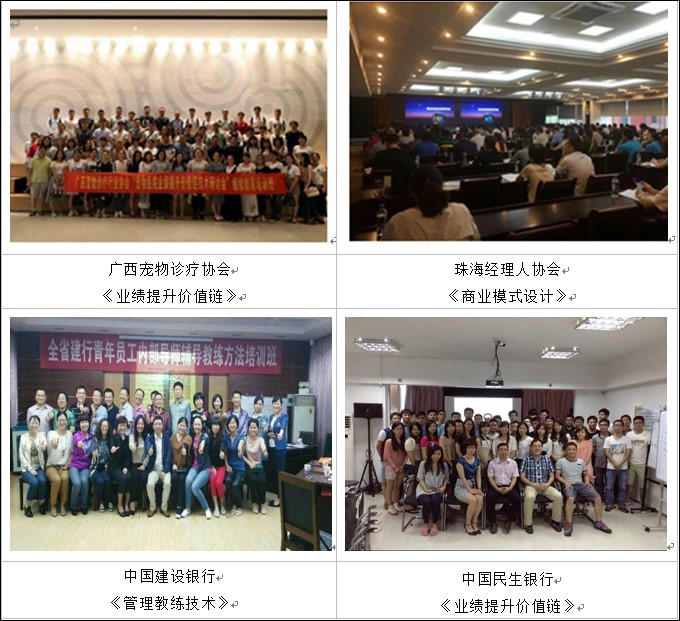 其中,廣東小白龍動漫文化股份有限公司連續(xù)6年返聘《企業(yè)轉(zhuǎn)型與戰(zhàn)略規(guī)劃》、《商業(yè)模式設(shè)計》、《運(yùn)營模式設(shè)計》、《營銷模式創(chuàng)新》、《業(yè)績爆破——營銷關(guān)鍵價值鏈技術(shù)》、《價值倍增——新商業(yè)模式創(chuàng)新》、《賦能式教練領(lǐng)導(dǎo)力》、《管理教練技術(shù)》、課程培訓(xùn)及教練輔導(dǎo),好評率極高,并聘請老師為公司營銷總教練,助推企業(yè)連續(xù)6連取得年保持15%以上業(yè)績成長并掛牌新三板的佳績。