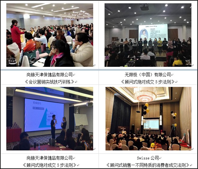 ★ 曾給尚赫天津保健用品有限公司員工講授《會議營銷實(shí)戰(zhàn)技巧訓(xùn)練》、《顧問式銷售邀約技巧》、《銷售贏在溝通》、《顧問式絕對成交5步法則》等系列課程,協(xié)助企業(yè)完成精英團(tuán)隊的打造,培訓(xùn)過程采用項目方式,邊培訓(xùn),邊領(lǐng)導(dǎo)團(tuán)隊實(shí)施項目改善,經(jīng)過《會議營銷實(shí)戰(zhàn)技巧訓(xùn)練》課程后,團(tuán)隊學(xué)以致用,在實(shí)際銷售實(shí)踐中,團(tuán)隊銷售翻翻。在此期間培訓(xùn)返聘率達(dá)到100%。
