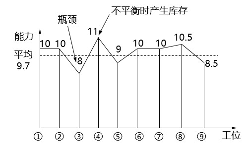 工位③能力最低易造成生產(chǎn)瓶頸,工位④能力最大易產(chǎn)生庫(kù)存,這種能力不均會(huì)引起浪費(fèi)。因此,要盡可能地減少這種不均衡的產(chǎn)生,即消除不平均現(xiàn)象的均衡化。