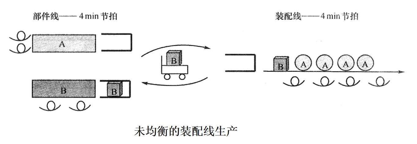 某汽車裝配線裝配A、B兩種車型,裝配順序是4個(gè)A型車和2個(gè)B型車循環(huán)。裝配線和部件線的生產(chǎn)節(jié)拍都是4min,生產(chǎn)部件A和B的工序都需要兩名操作工。由于車型的不同而需要不同的部件,即裝配A型車需要用到A部件,裝配B型車需要用到B部件,如下圖所示。