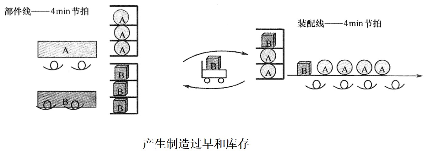 (1)如果按照準(zhǔn)時(shí)化的生產(chǎn)要求進(jìn)行生產(chǎn),當(dāng)后工序裝配線裝配B型車時(shí),需要使用B部件,則生產(chǎn)A部件的生產(chǎn)線等待,反之亦然,這樣就造成了等待的浪費(fèi)。
