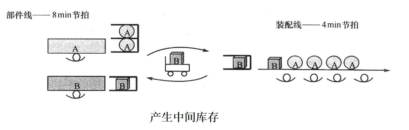(3)為了解決上述問題,如果將部件線的生產(chǎn)節(jié)拍調(diào)整到8min,各工位無等待現(xiàn)象,并且生產(chǎn)能力配置可減少50%(如部件線操作人員只需1人)。但是后工序的裝配線在使用其中一種部件時(shí),另一種部件會(huì)有中間庫(kù)存。例如,后工序的裝配線在使用部件B時(shí),A部件線還在生產(chǎn),但A部件并未領(lǐng)取,因此出現(xiàn)中間庫(kù)存,最多時(shí)會(huì)出現(xiàn)2個(gè)A部件。