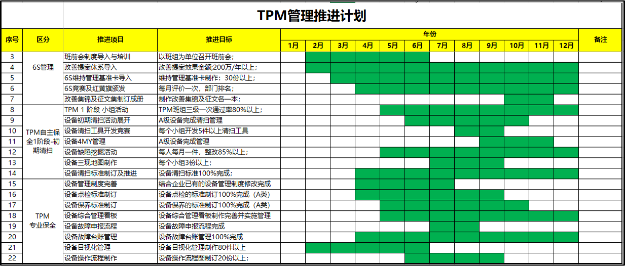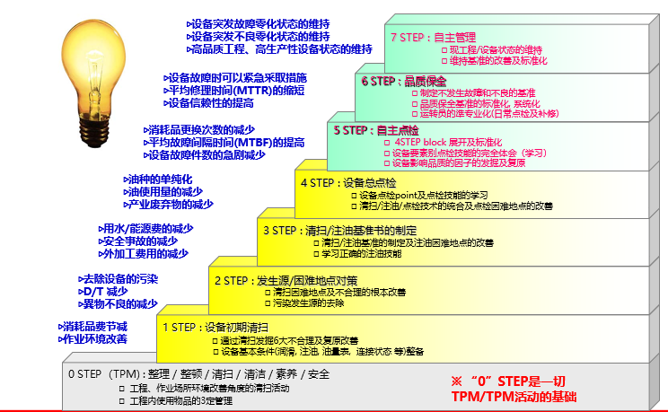TPM 7 STEP是自主管理:通過(guò)持續(xù)的TPM各STEP的活動(dòng),員工綜合素養(yǎng)和能力達(dá)到最佳化,前期標(biāo)準(zhǔn)化內(nèi)容形成企業(yè)管理的制度,優(yōu)化各項(xiàng)管理的流程,確保成為行業(yè)最高競(jìng)爭(zhēng)力的公司。