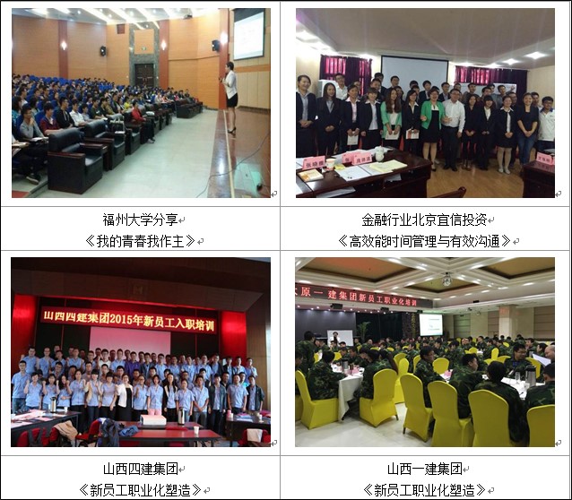 大型國有企業(yè):廣東省機(jī)場集團(tuán)、南京公路集團(tuán)、山西一建、山西四建、中電建,其中電建水環(huán)境公司采購老師《陽光心態(tài)與感恩工作》《人際溝通與交往藝術(shù)》課程30期,中國移動《職場壓力與情緒管理》采購量100余天;
