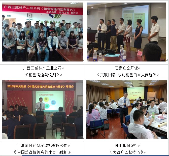 黎老師24年的營銷管理和培訓(xùn)生涯,積累了豐富的企業(yè)管理實戰(zhàn)和顧問經(jīng)驗,授課方式新穎獨特,重視與學(xué)員間的互動、交流來啟發(fā)學(xué)員,使學(xué)員在視覺、聽覺、觸覺、思維模式上形成多方位的感受,從而使之產(chǎn)生體驗;并將理論與實戰(zhàn)、認(rèn)知與實踐相結(jié)合,重視激發(fā)學(xué)員思維內(nèi)在視角,啟迪團隊靈性及感悟智慧,其博取眾長,形象生動的授課風(fēng)格,幽默和極富感染的表達(dá)力,營造了一個個活潑有趣的培訓(xùn)課堂,充分激發(fā)了學(xué)員的潛能,使參訓(xùn)者的專業(yè)知識和技能在較短的培訓(xùn)時間內(nèi)得到了升華,深受客戶的歡迎和好評。